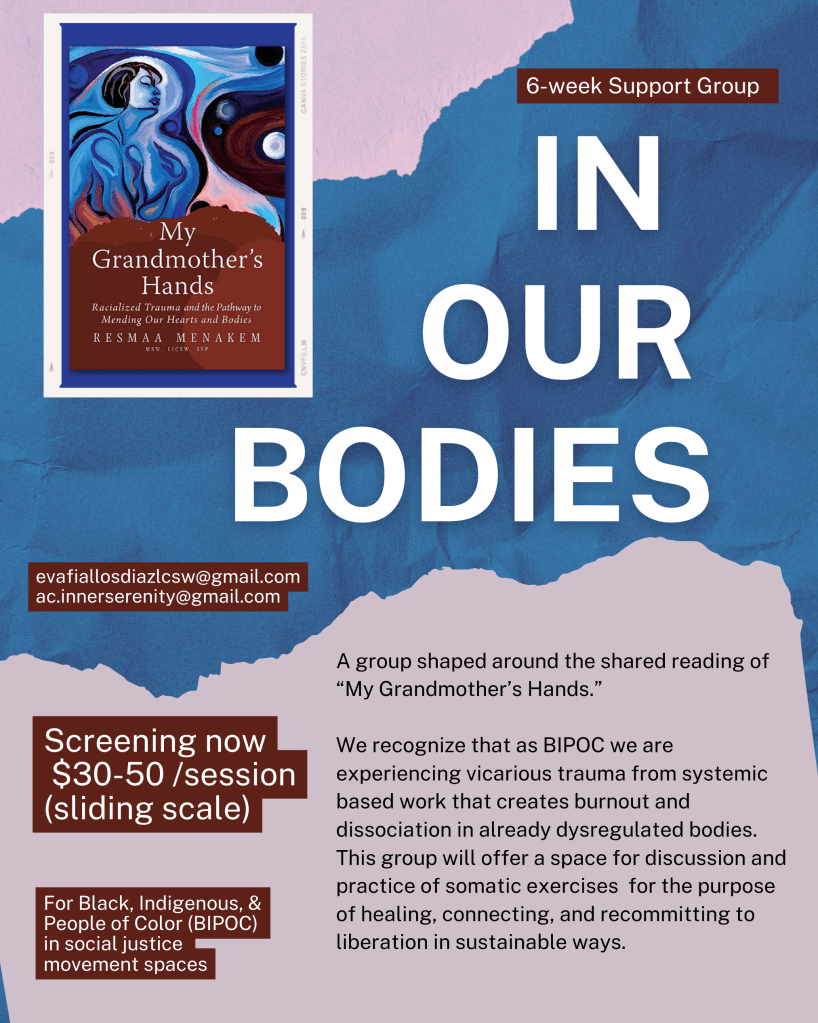 We are now screening for an anticipated August 2024 start! What is it? A 6 week peer support group for Black, Indigenous, and other people of color in social justice movement spaces (social workers, activists, organizers, advocates, educators, and healers). This group will be shaped around the shared reading of the book “My Grandmother’s Hands.”…